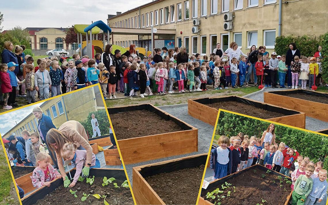 Każda grupa miała swojego przedstawiciela, który z dumą umieścił tabliczkę z nazwą swojej klasy, wyznaczając miejsce dla swojej roślinnej hodowli. Następnie dzieci z ogromnym zapałem przystąpiły do sadzenia sadzonek, zamieniając ogród w tętniącą życiem przestrzeń. Tego dnia nie brakowało radości i entuzjazmu, a małych ogrodników nie trzeba było długo namawiać do pracy.