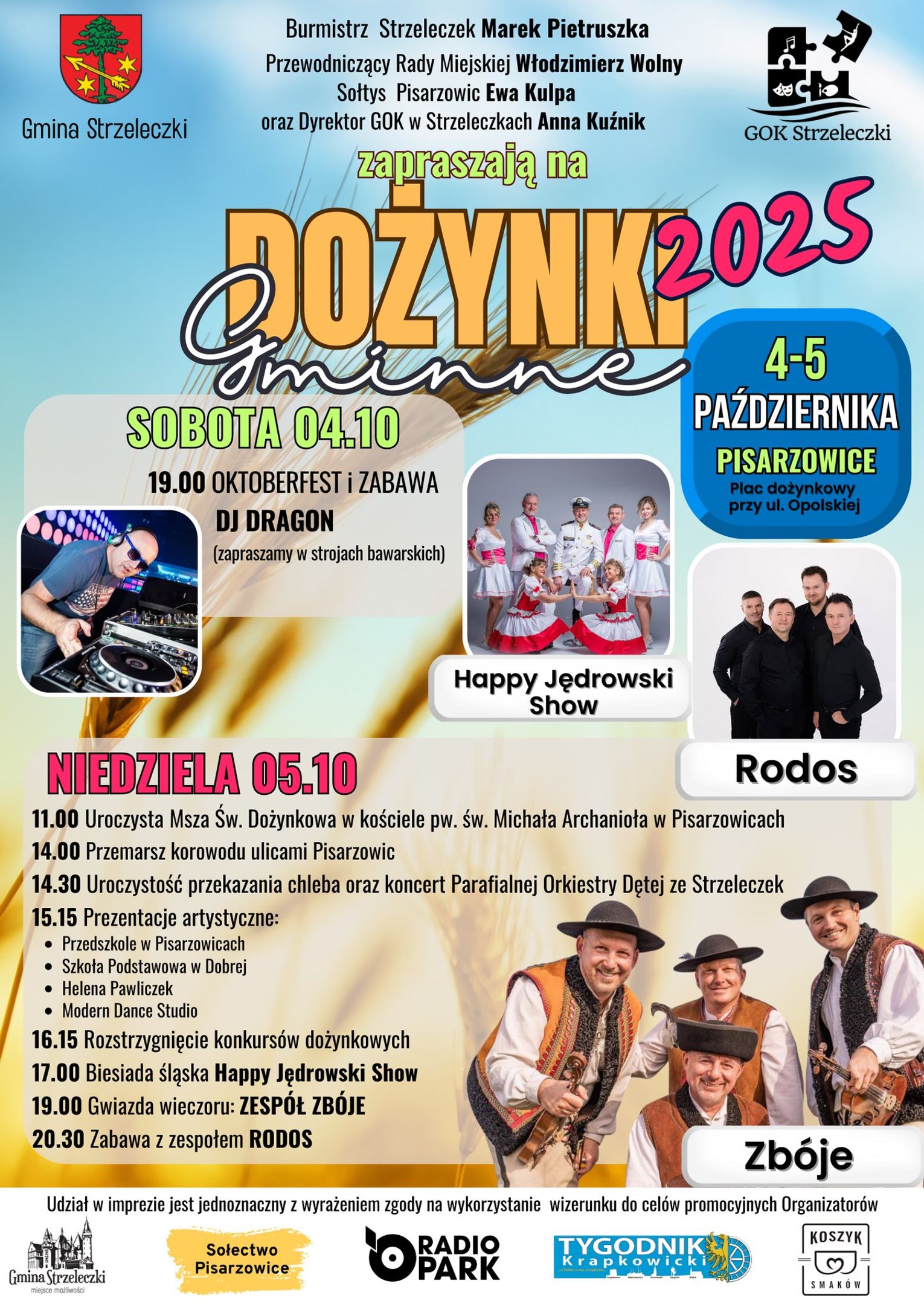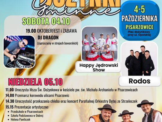 O 11.00 – msza dożynkowa w kościele św. Michała Archanioła. O 14.00 – korowód ulicami Pisarzowic. Potem przekazanie chleba i koncert orkiestry dętej ze Strzeleczek. Od 15.15 scena należy do lokalnych artystów: dzieci, młodzież i tancerze pokażą, co potrafią. O 16.15 rozstrzygnięcie konkursów dożynkowych, a wieczorem znów wracamy do imprezowego klimatu. Najpierw „Happy Jędrowski Show”, później występ zespołu Zbóje, a na koniec – zabawa z grupą Rodos.