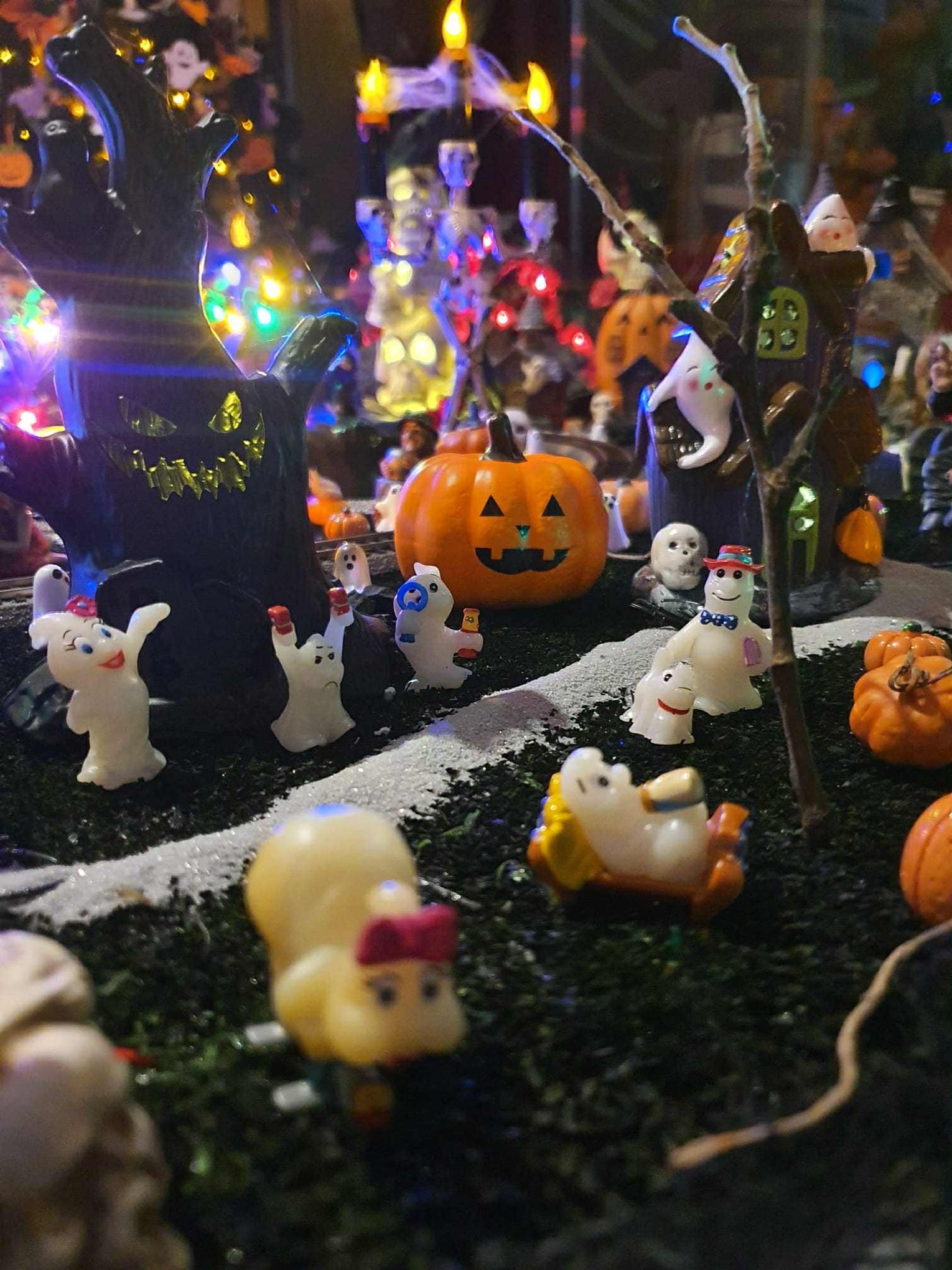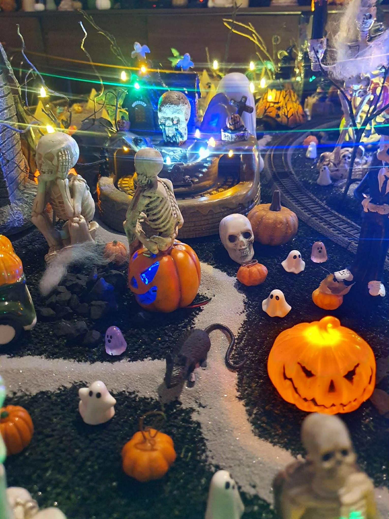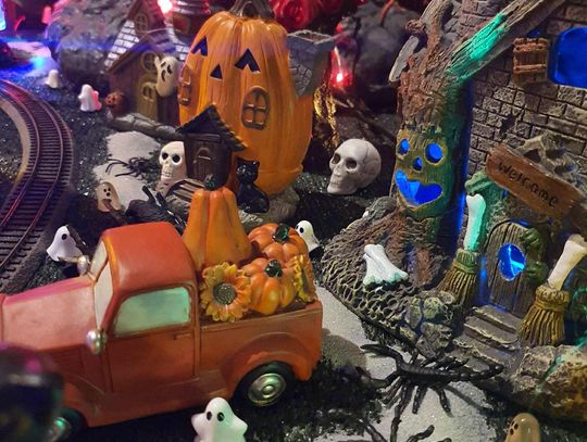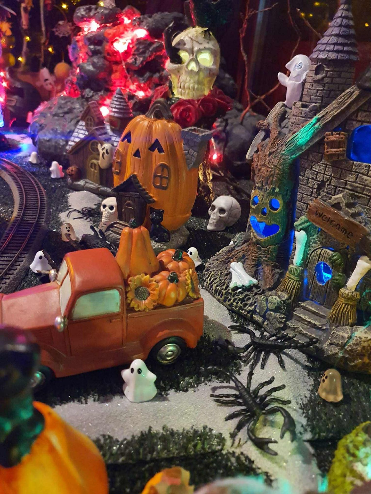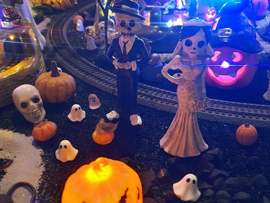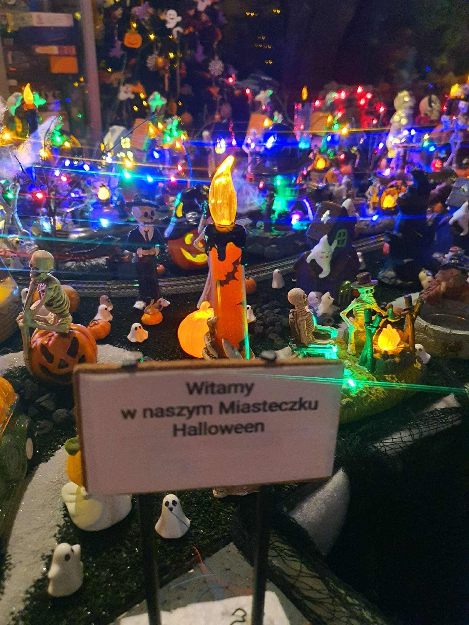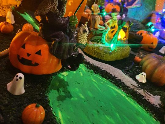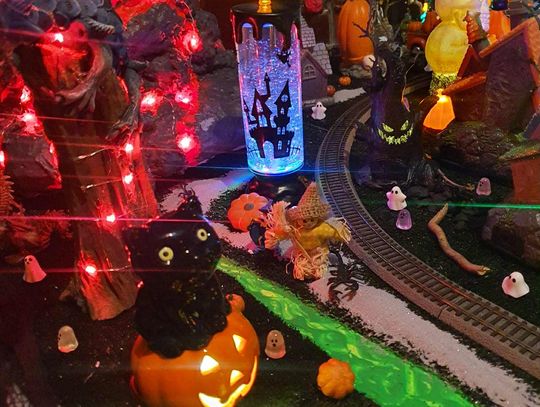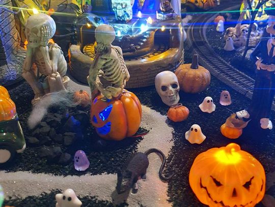 Na makiecie tętni życie: świecące duszki, ruchome wampiry, a między nimi – miniaturowa lokomotywa z wagonami pełnymi pomarańczowych dyń. To widowisko światła, ruchu i pomysłowości, które przyciąga całe rodziny.