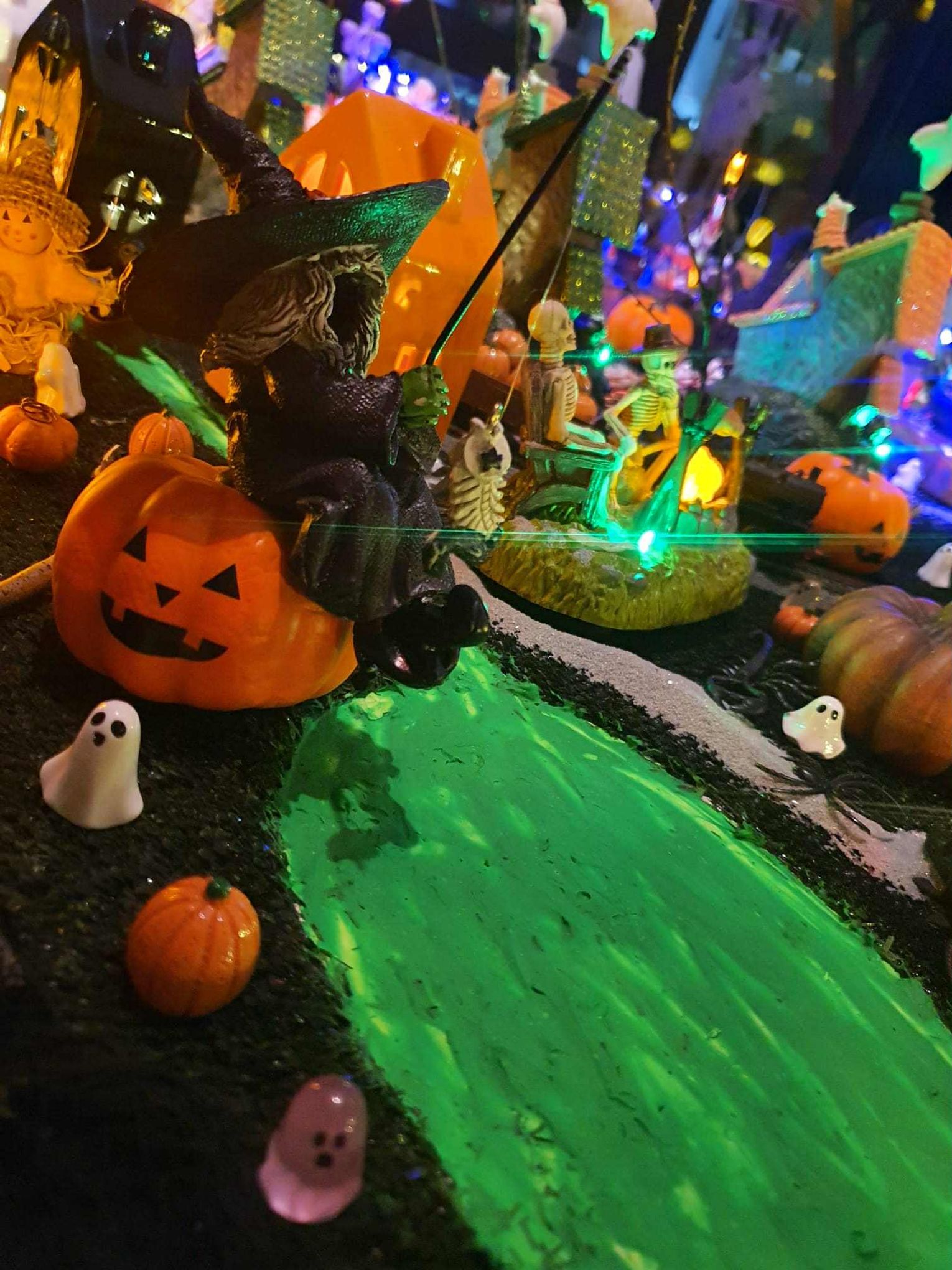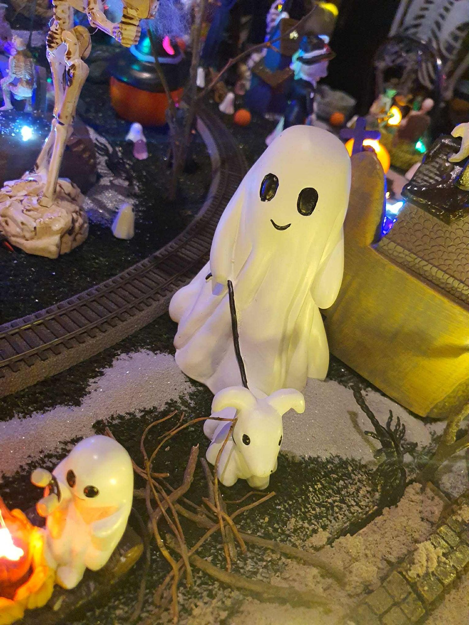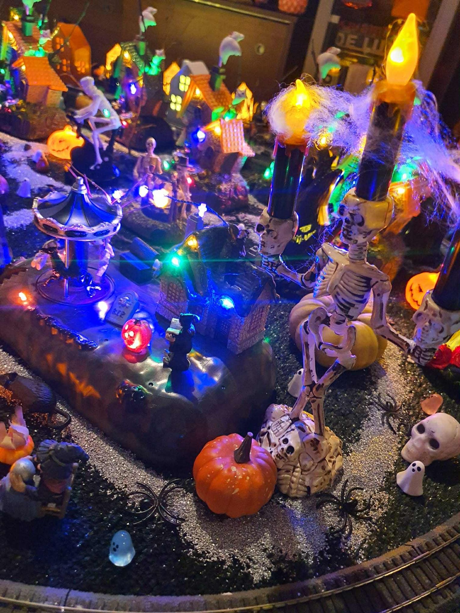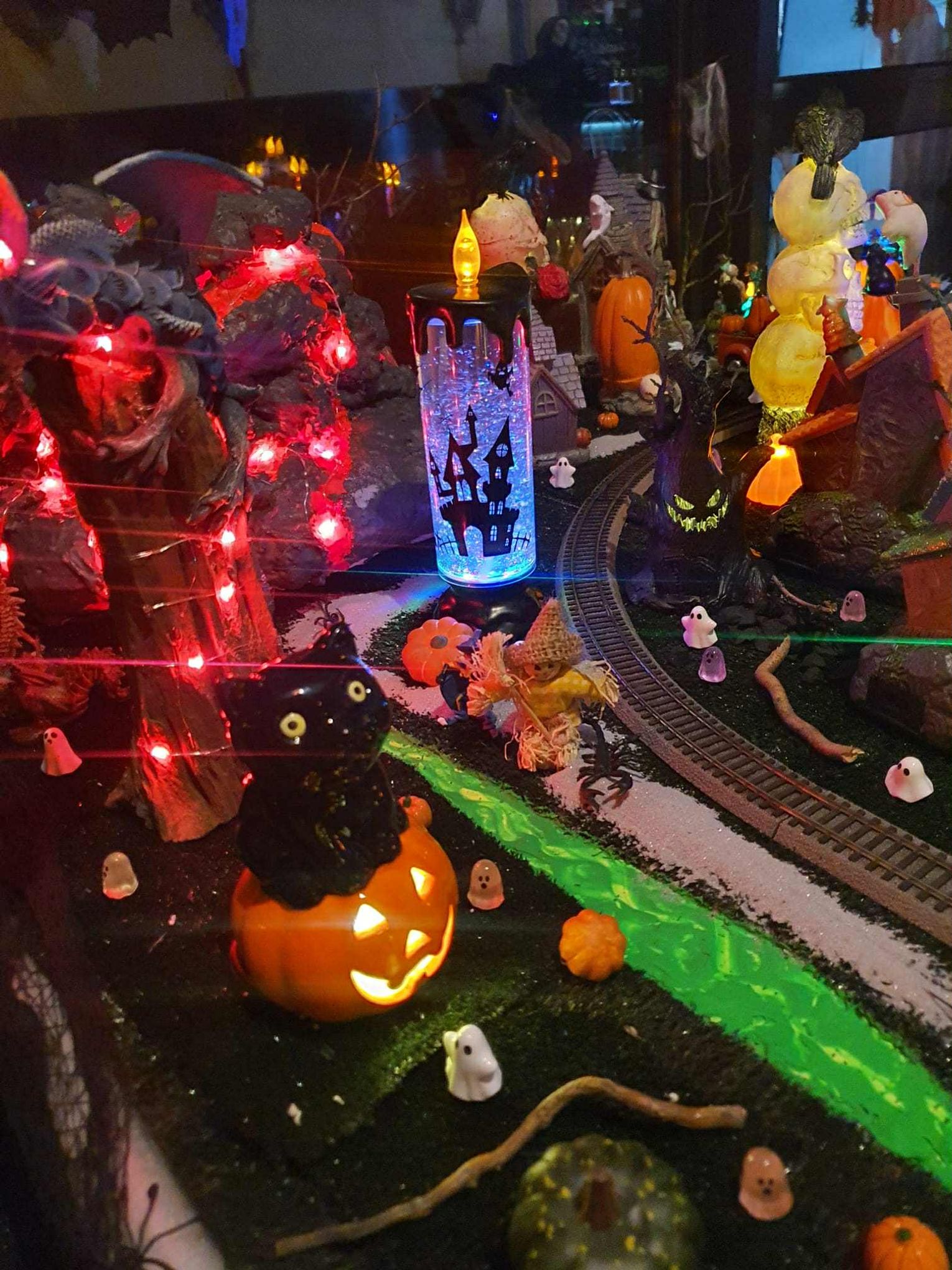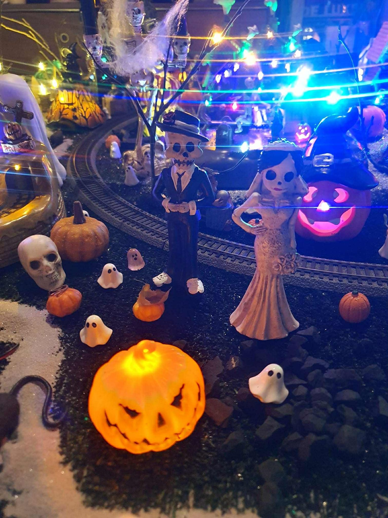 Na makiecie tętni życie: świecące duszki, ruchome wampiry, a między nimi – miniaturowa lokomotywa z wagonami pełnymi pomarańczowych dyń. To widowisko światła, ruchu i pomysłowości, które przyciąga całe rodziny.