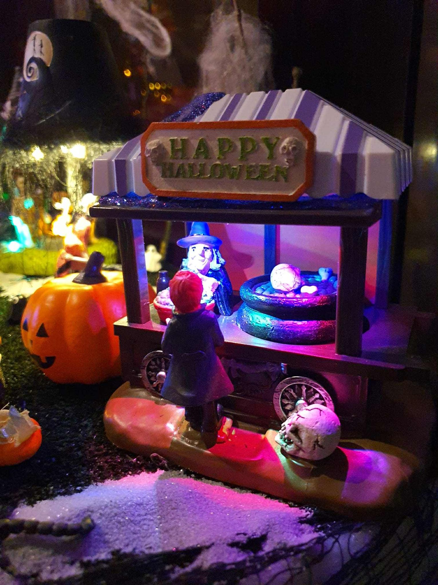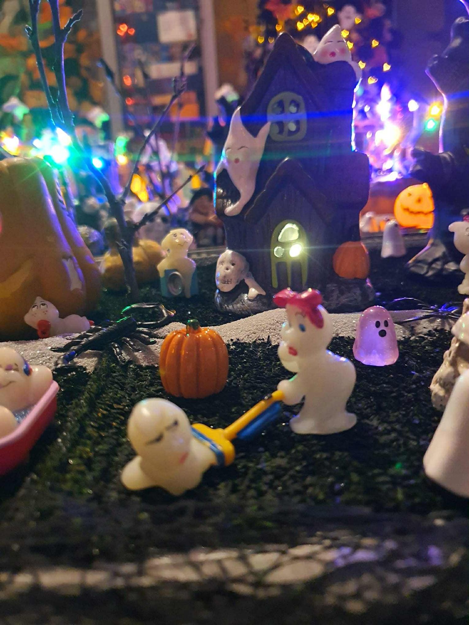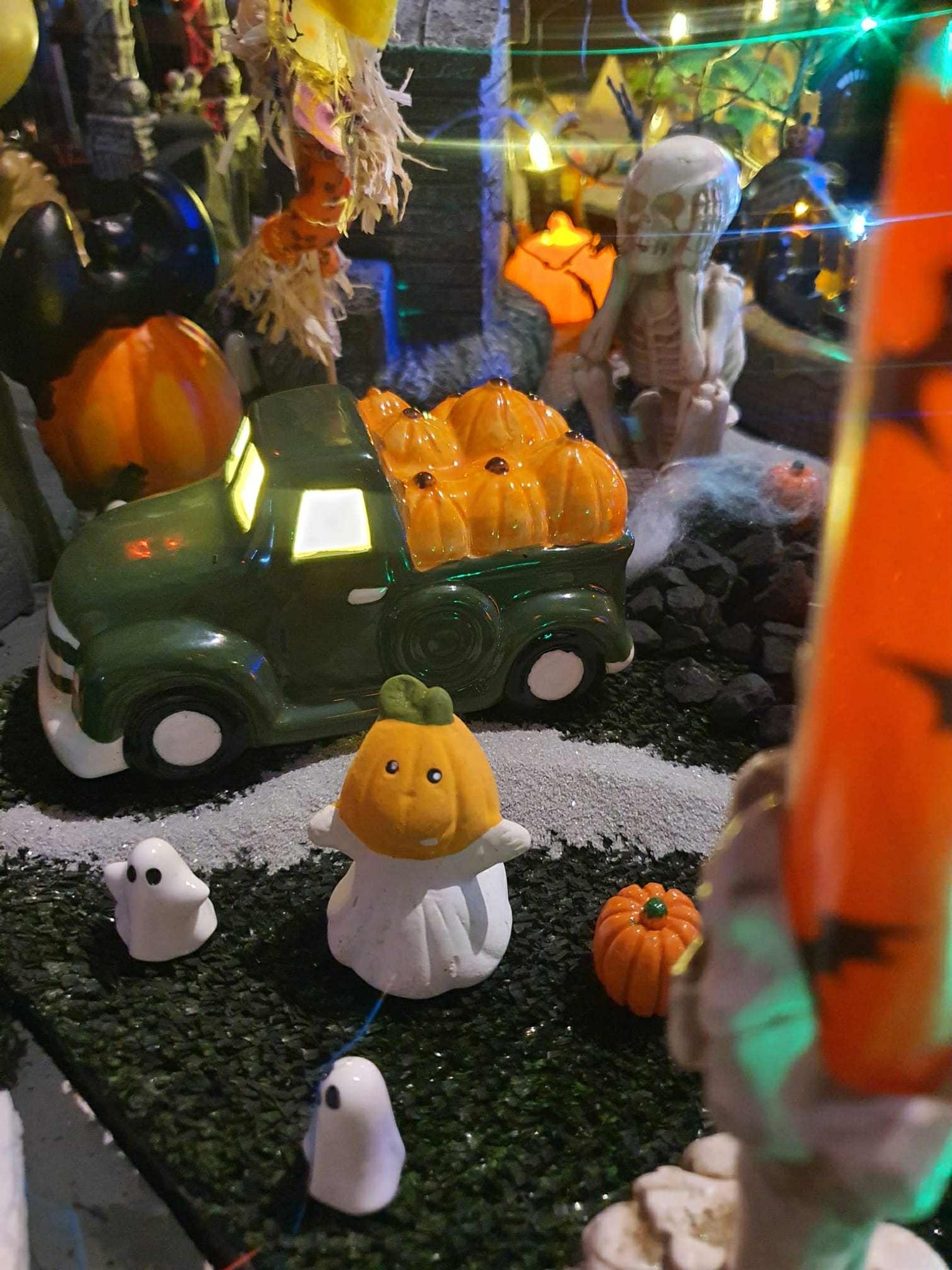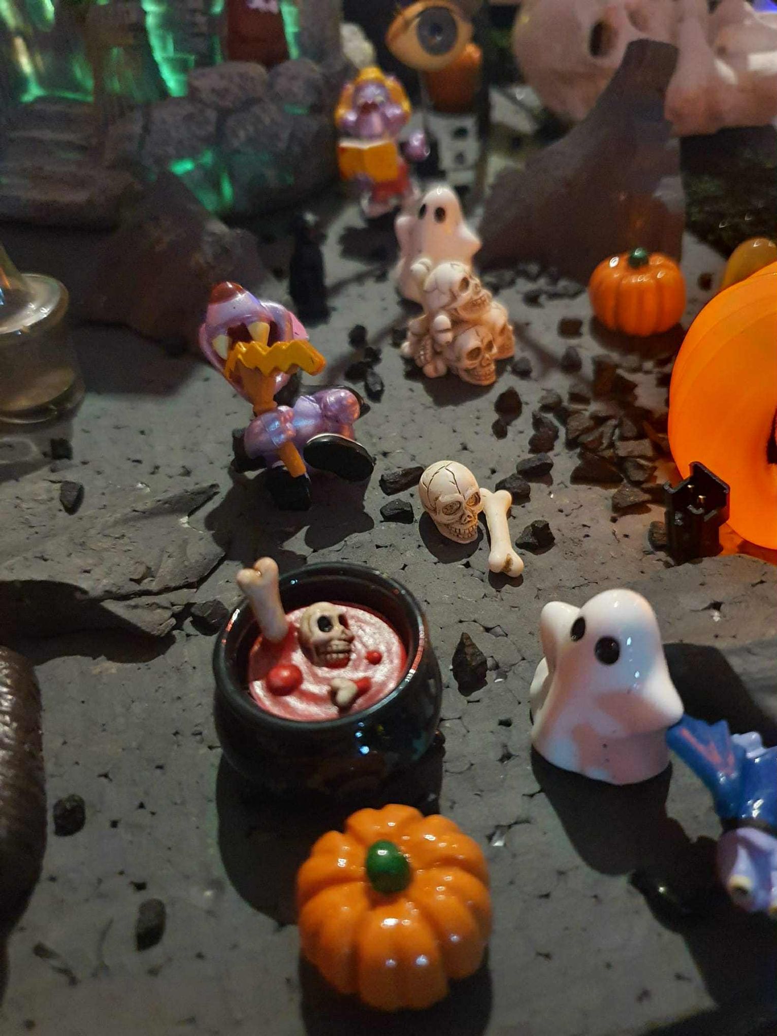 Na makiecie tętni życie: świecące duszki, ruchome wampiry, a między nimi – miniaturowa lokomotywa z wagonami pełnymi pomarańczowych dyń. To widowisko światła, ruchu i pomysłowości, które przyciąga całe rodziny.