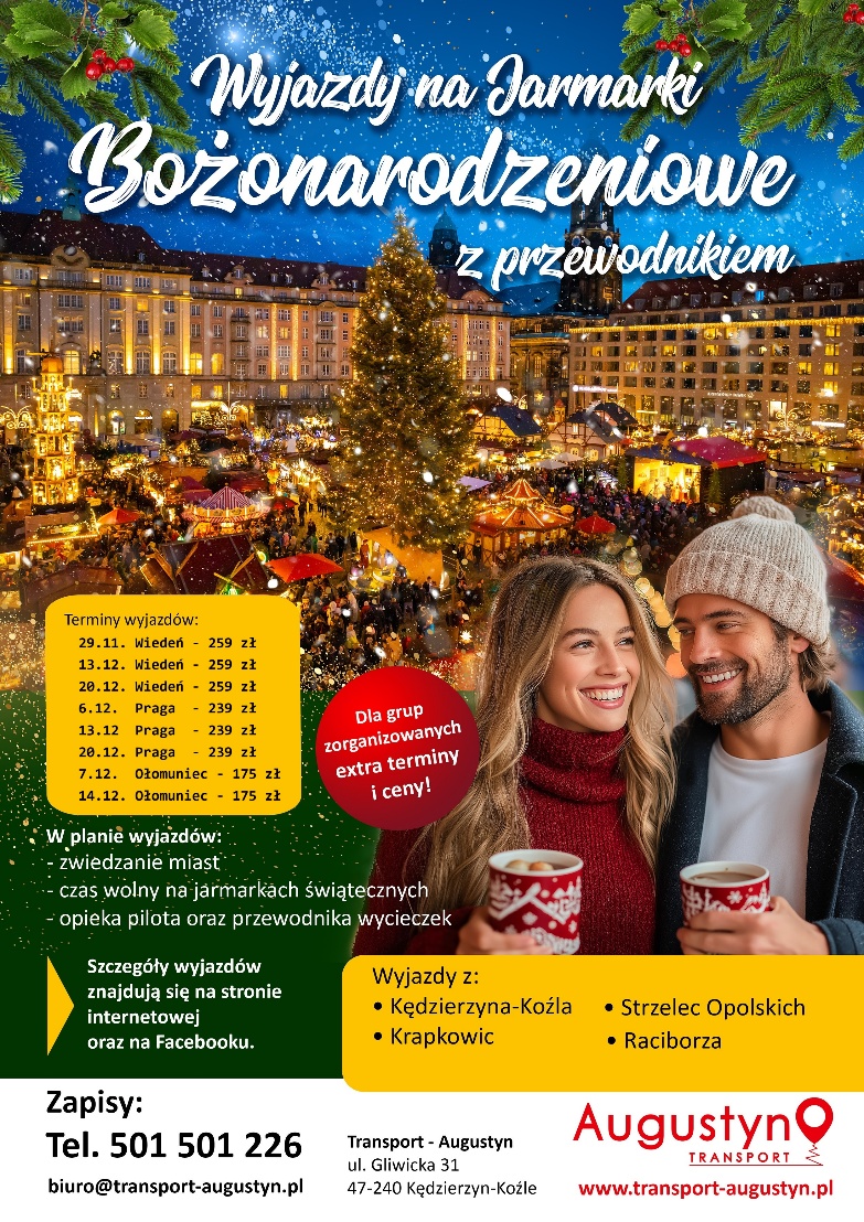 W okresie przedświątecznym firma będzie organizować wyjazdy na najpiękniejsze Jarmarki Bożonarodzeniowe do Pragi, Wiednia i Ołomuńca. Oferta jest bardzo ciekawa, ponieważ usługa obejmuje nie tylko przejazd, ale również zwiedzanie miast z licencjonowanymi przewodnikami oraz opiekę pilotów wycieczek.