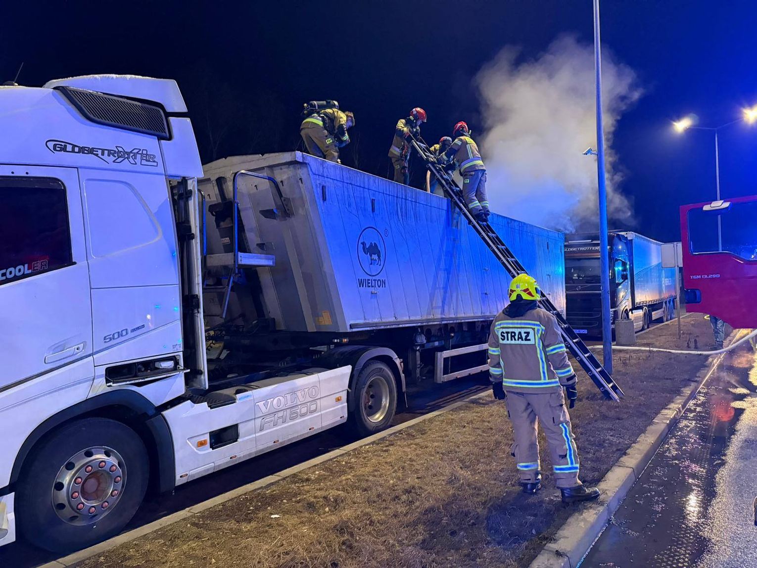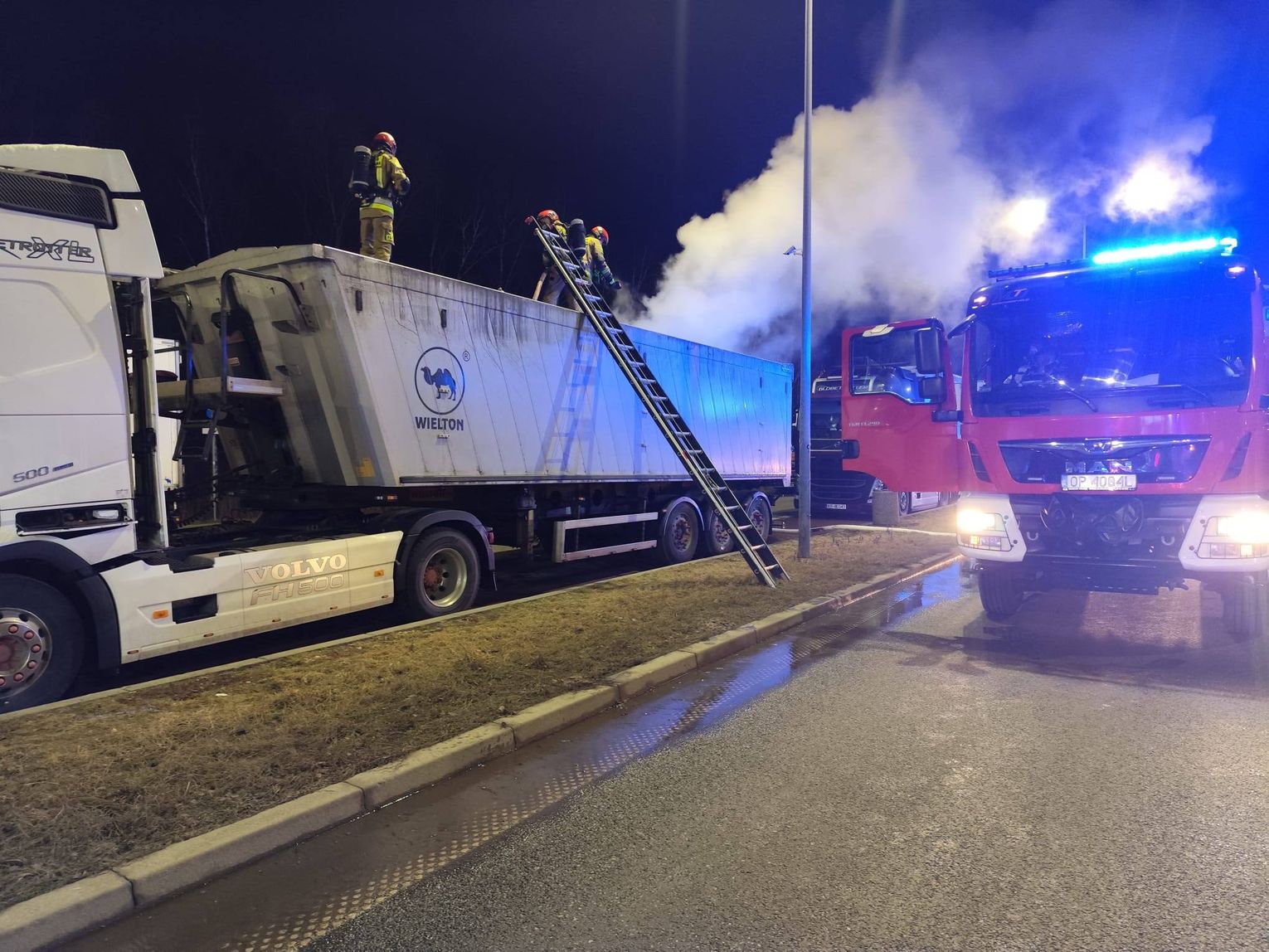 Na miejsce zadysponowano zastępy z Komendy Powiatowej Państwowej Straży Pożarnej w Krapkowicach oraz jednostkę OSP Odrowąż. Po dojeździe pierwszych sił kierujący działaniami ratowniczymi potwierdził pożar naczepy przewożącej koks.